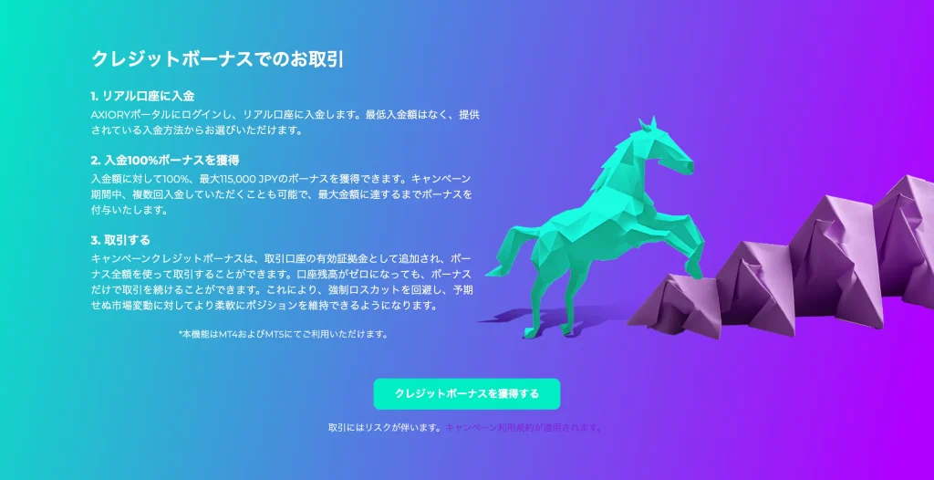 現在AXIORYでは、期間限定で最大115,000円がもらえる100%入金ボーナスキャンペーンを開催中!