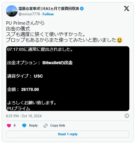 PUPrimeの口コミや評判はそれほど多くありませんが、日本のユーザーの投稿は主にXで確認できます。
