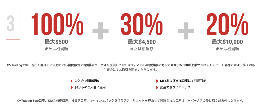 500ドルの入金までは100%ボーナス、次の4,500ドルまでは30%ボーナス、その次の10,000ドルまでは20%ボーナスが受け取れます。