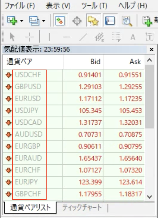 ①MT4にログインすると左上の気配値に表示されている通貨ペアがグレー表示になっています。