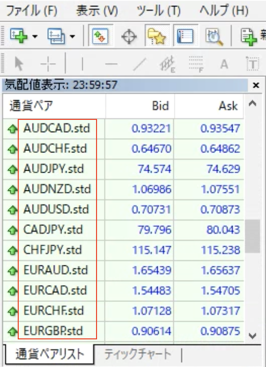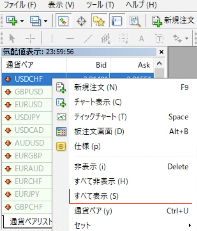 ②MT4の気配値で右クリックし、「すべて表示」をクリックして下さい。