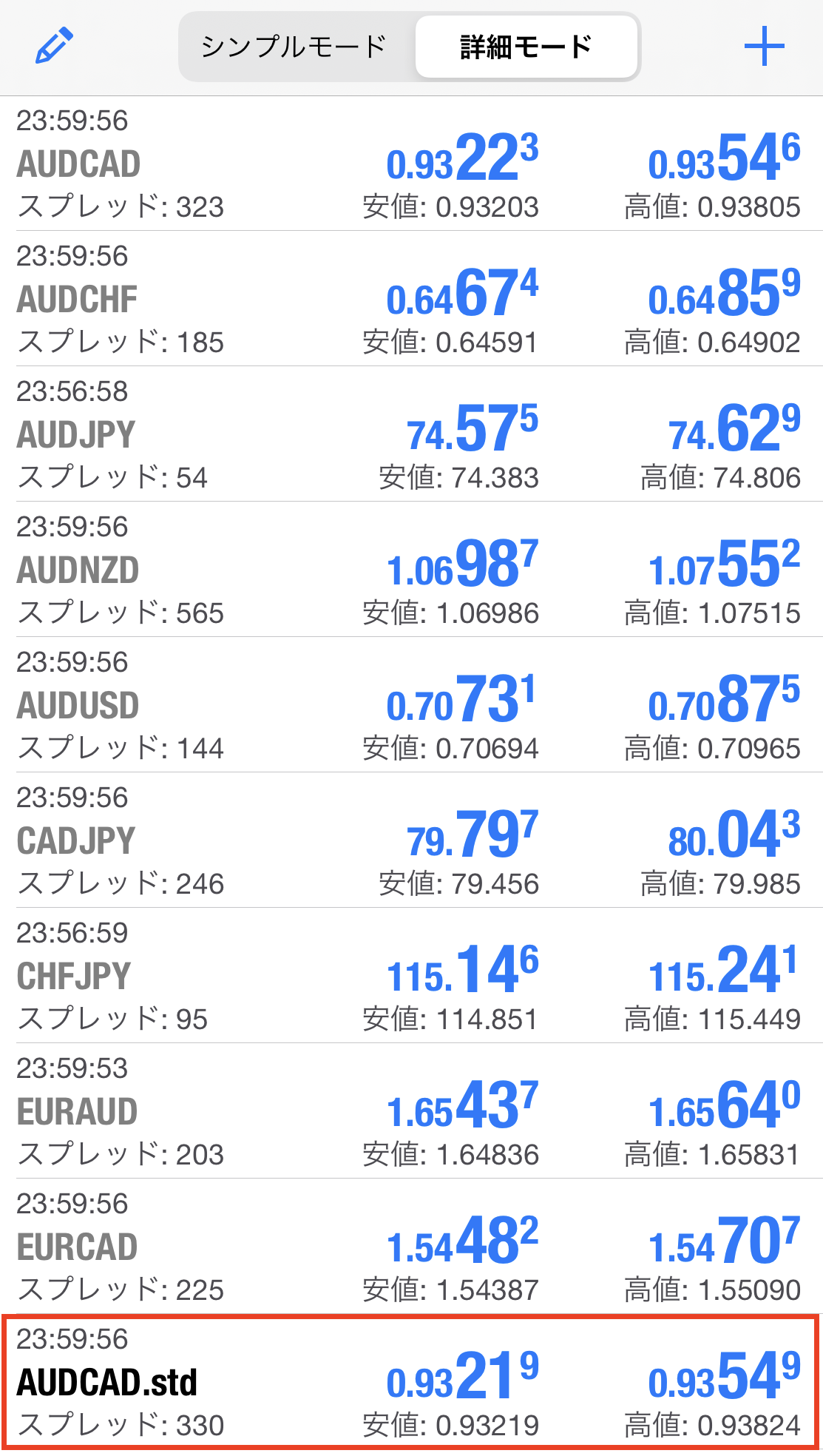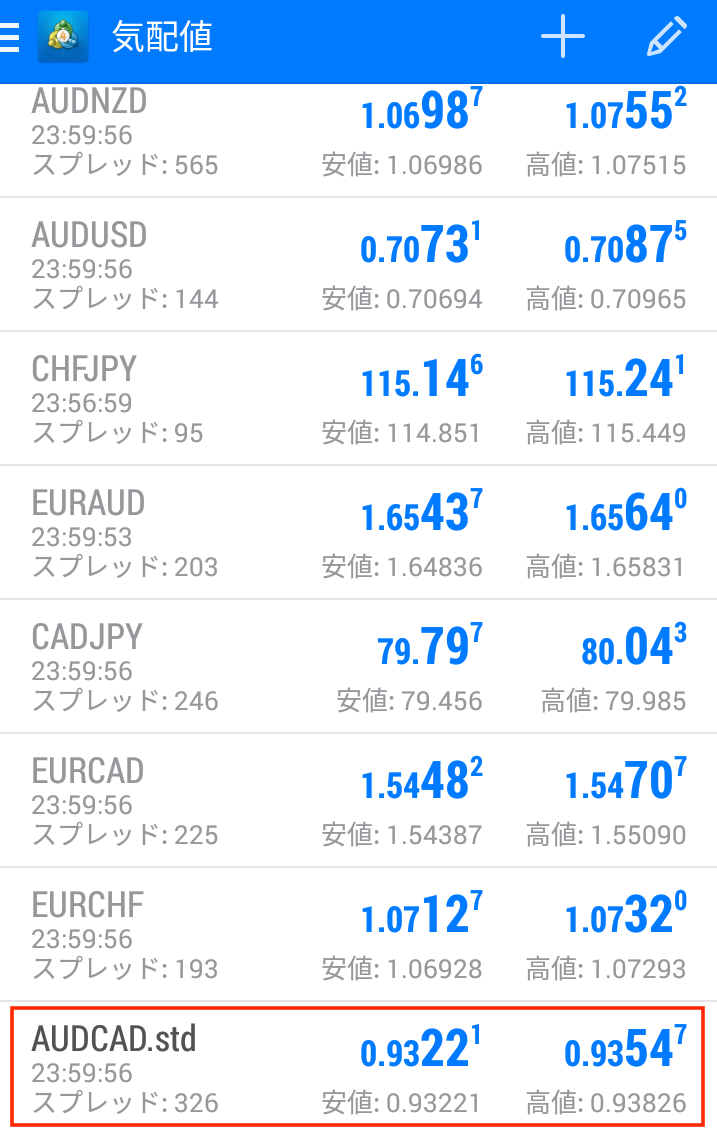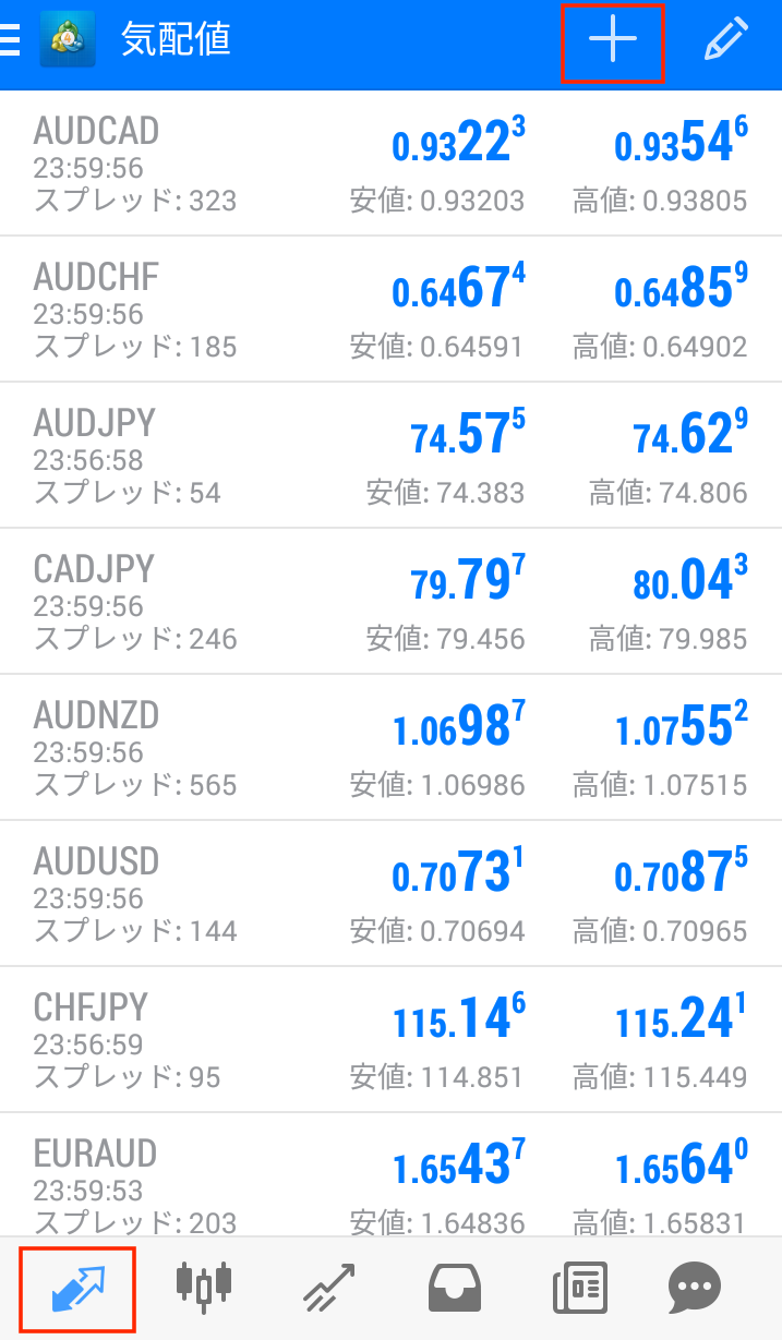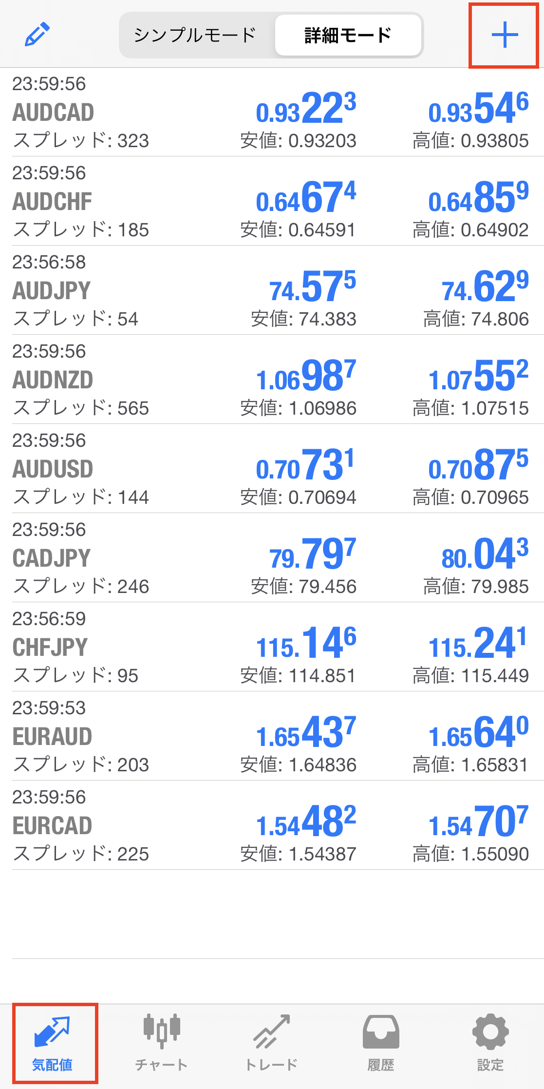 ①画面下の「気配値」をタップすると通貨ペアの一覧が表示されます。続いて画面右上の「+」をタップしてください