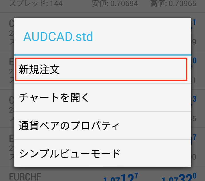 ⑤通貨ペア、「新規注文」とタップすると取引画面に移動します。