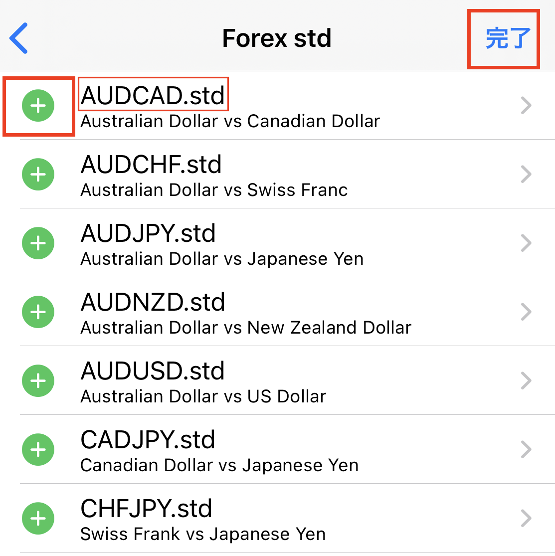 ③取引通貨ペアを選び左側の「+」をタップをするとシンボルの追加が完了します。