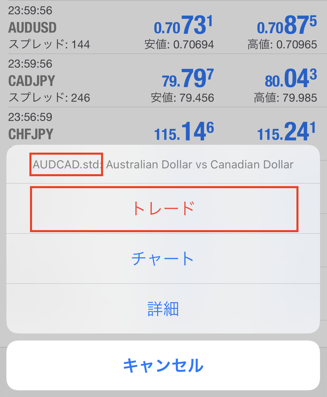 ⑤通貨ペア、「トレード」とタップすると取引画面に移動します。