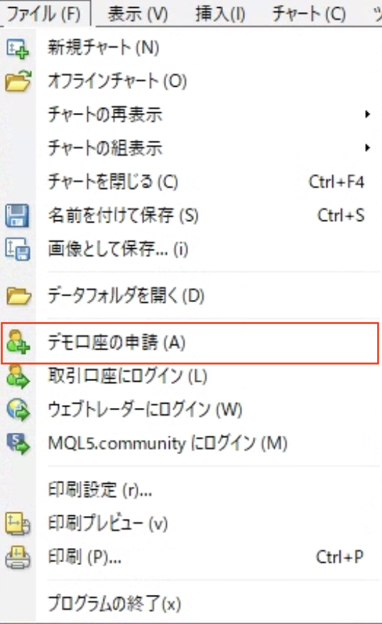 (1)メニューからファイル、デモ口座の申請の順にクリックします。